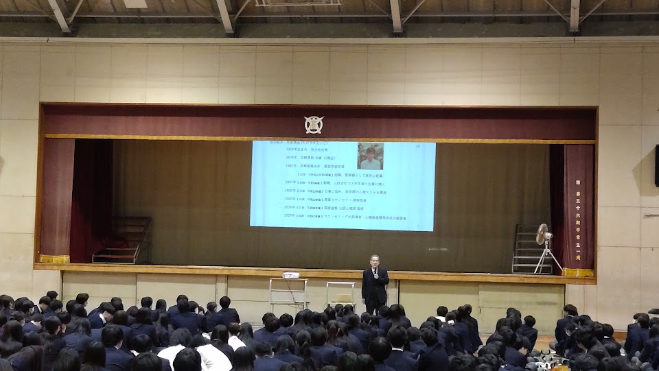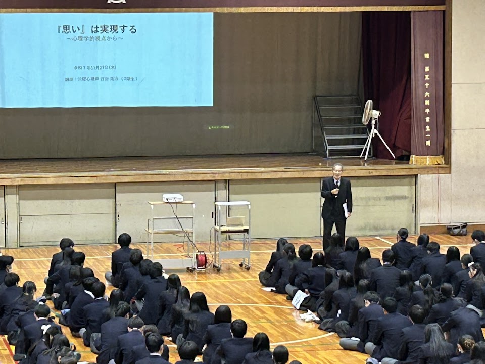 11月27日(木)、母校体育館にて桜美会主催による卒業生講演会を行いました。今年は2期生の竹安英治さんに講演をしていただきました。